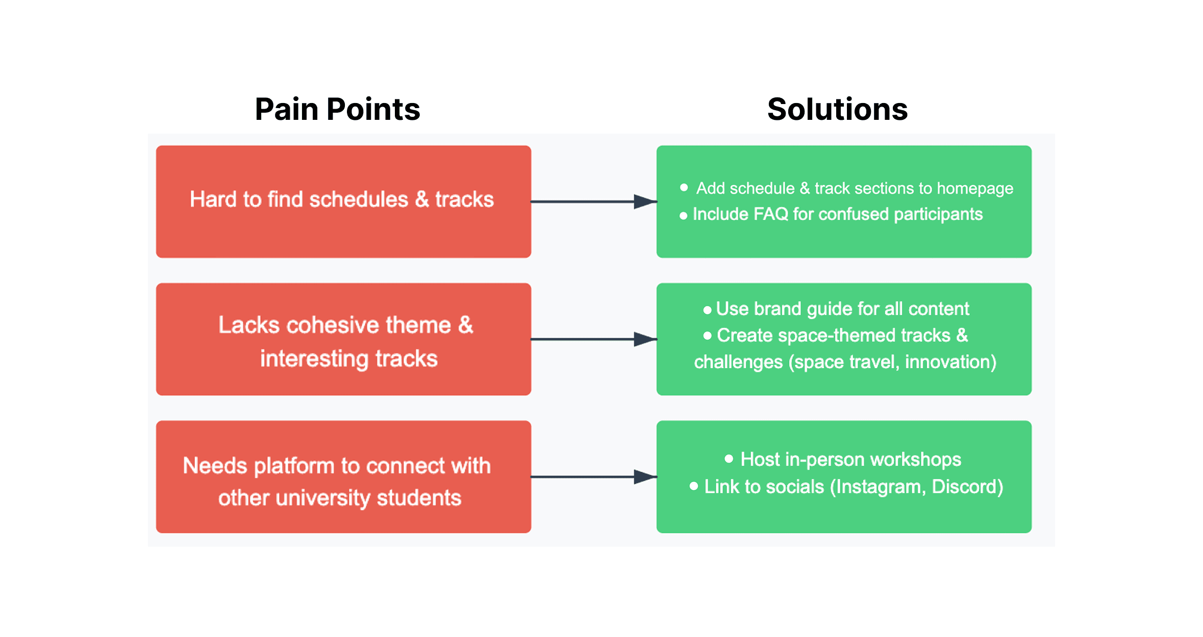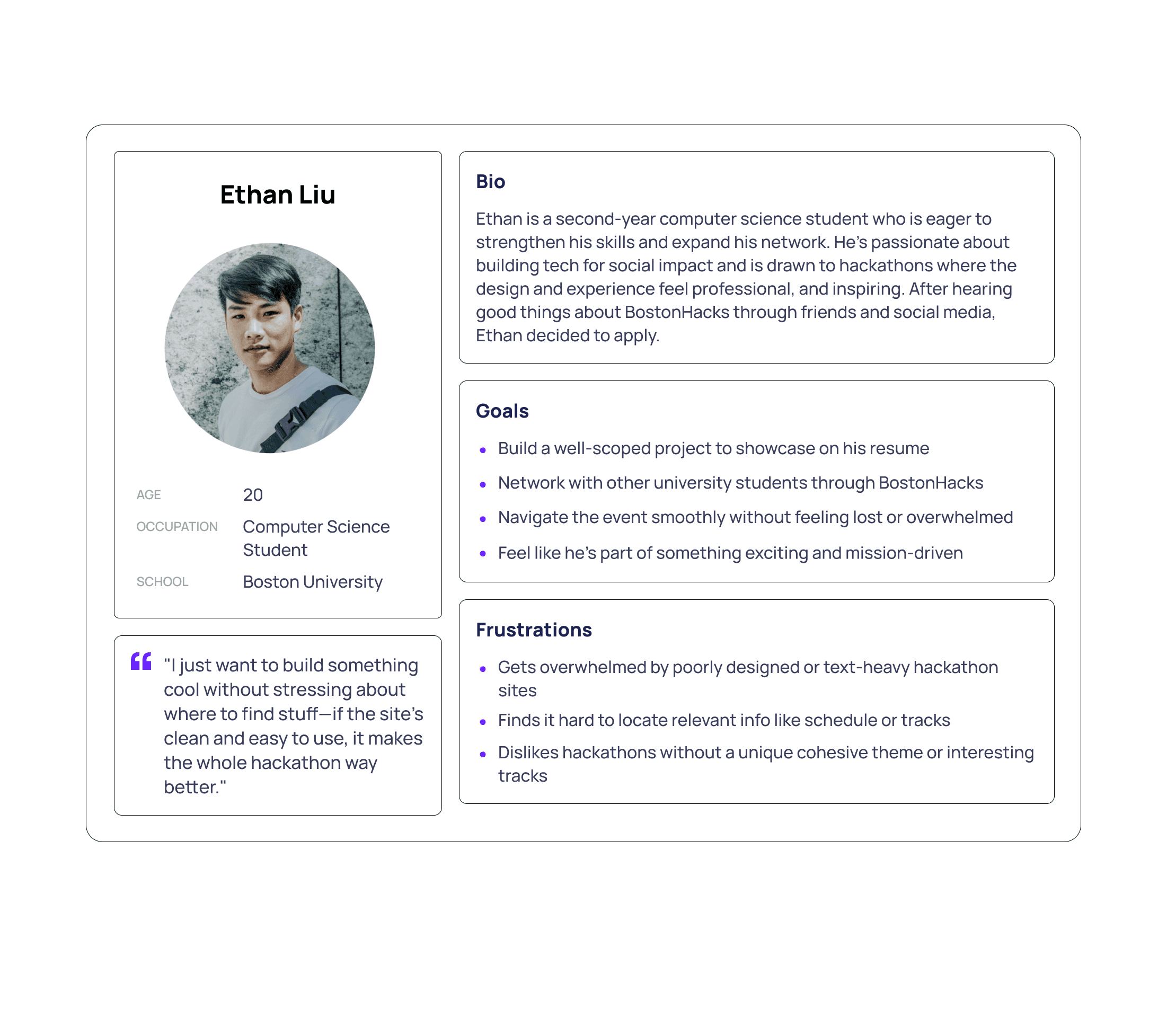 To better understand the needs of typical BostonHacks participants, I conducted UX research by reviewing past participant feedback, analyzing social media engagement, and asking about common behaviors among hackathon attendees. From here, we developed a persona.